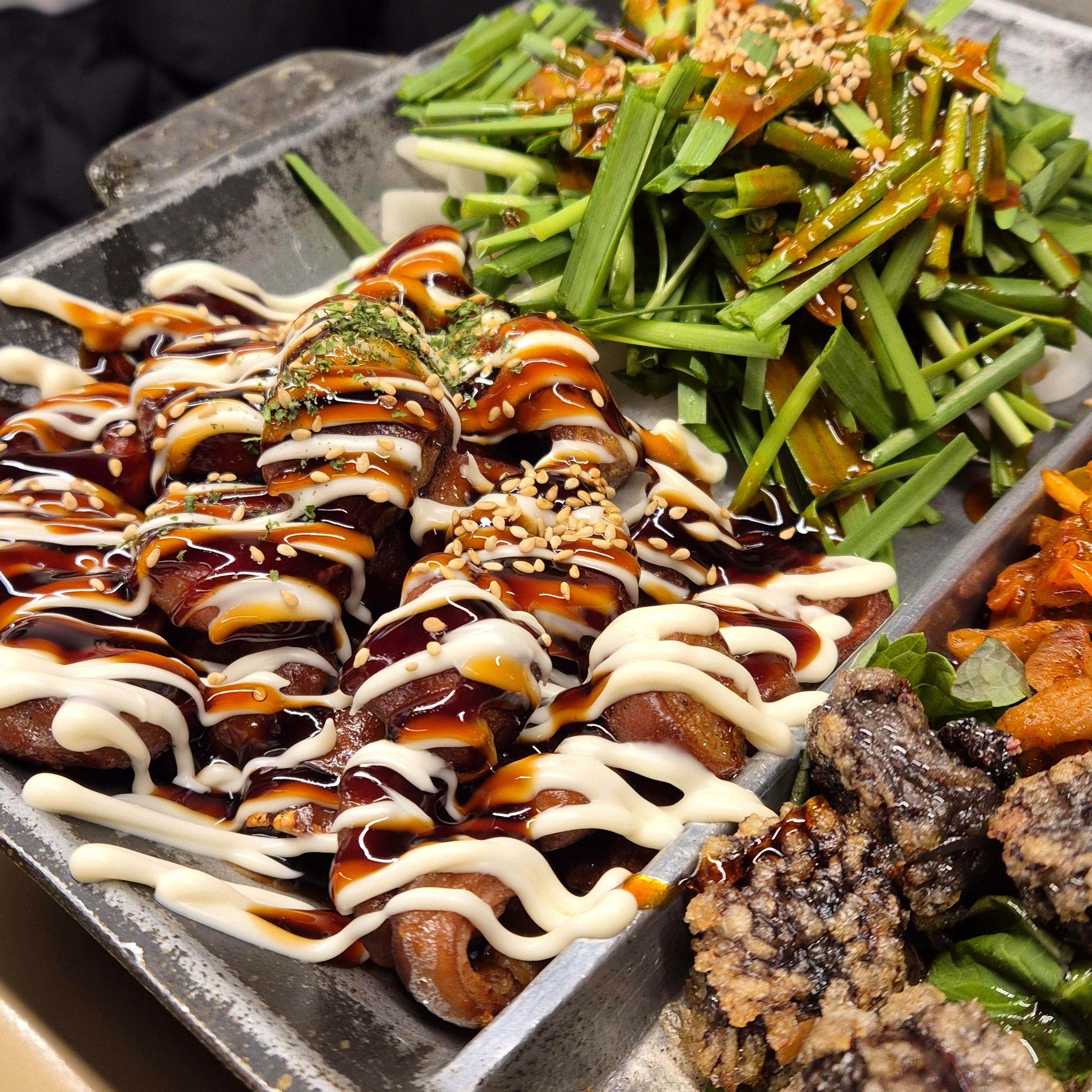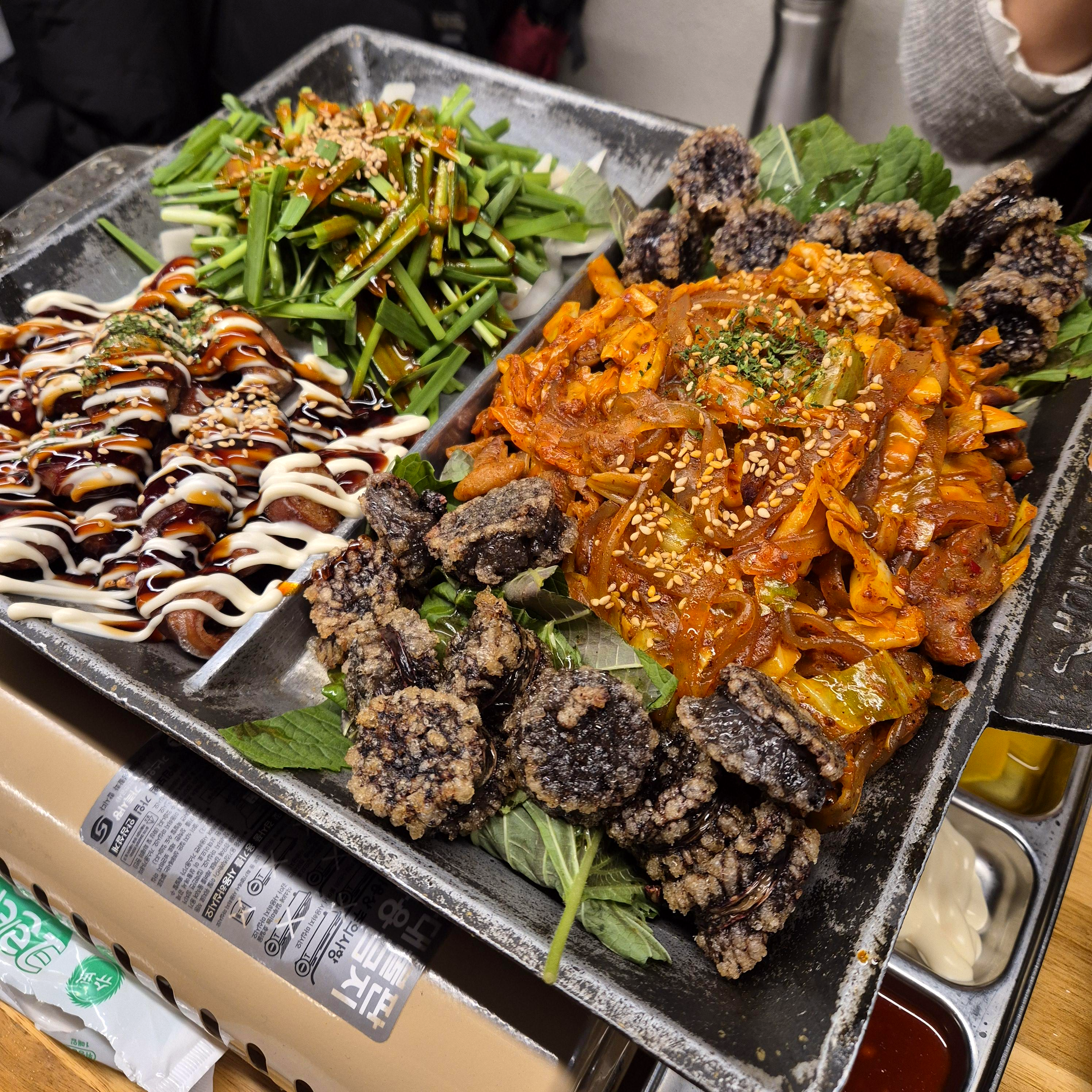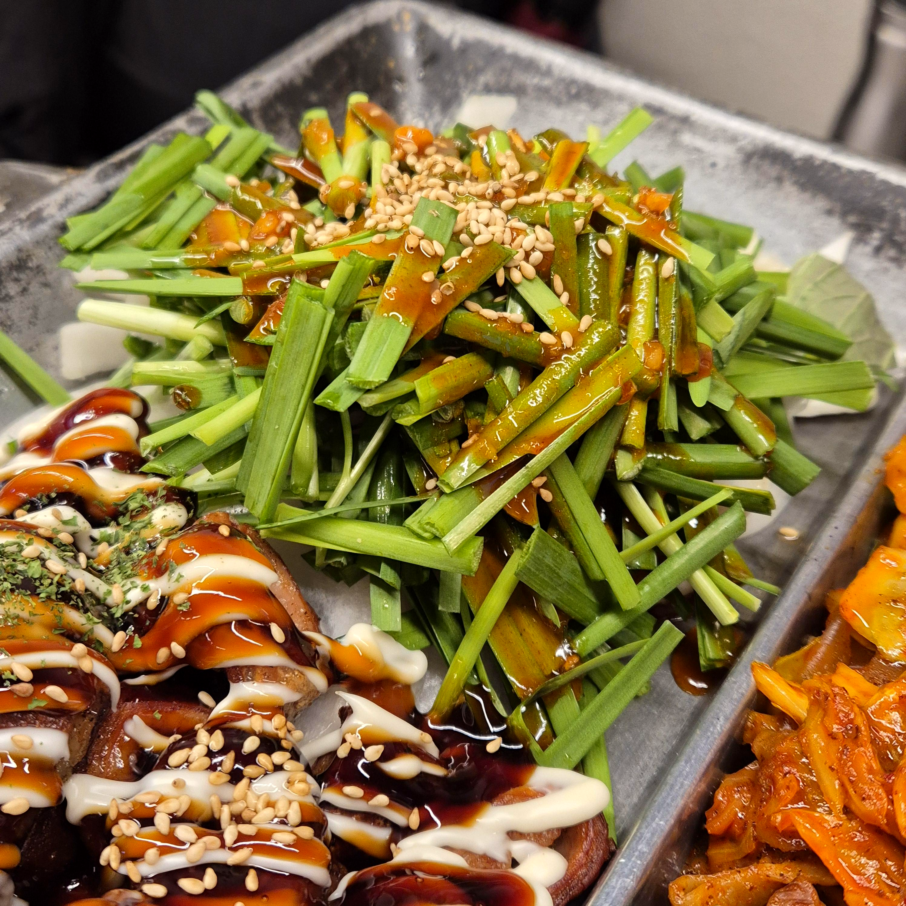 일단 진짜 이게 2인분 인가 싶을 정도로양이 어마무시했다. 비주얼도. 예술이었다. 마치 타코야끼도 있는 것 같았고, 한 4인분 시킨 거 같았다. 부추도 좋아하는데 아주 굿이다.