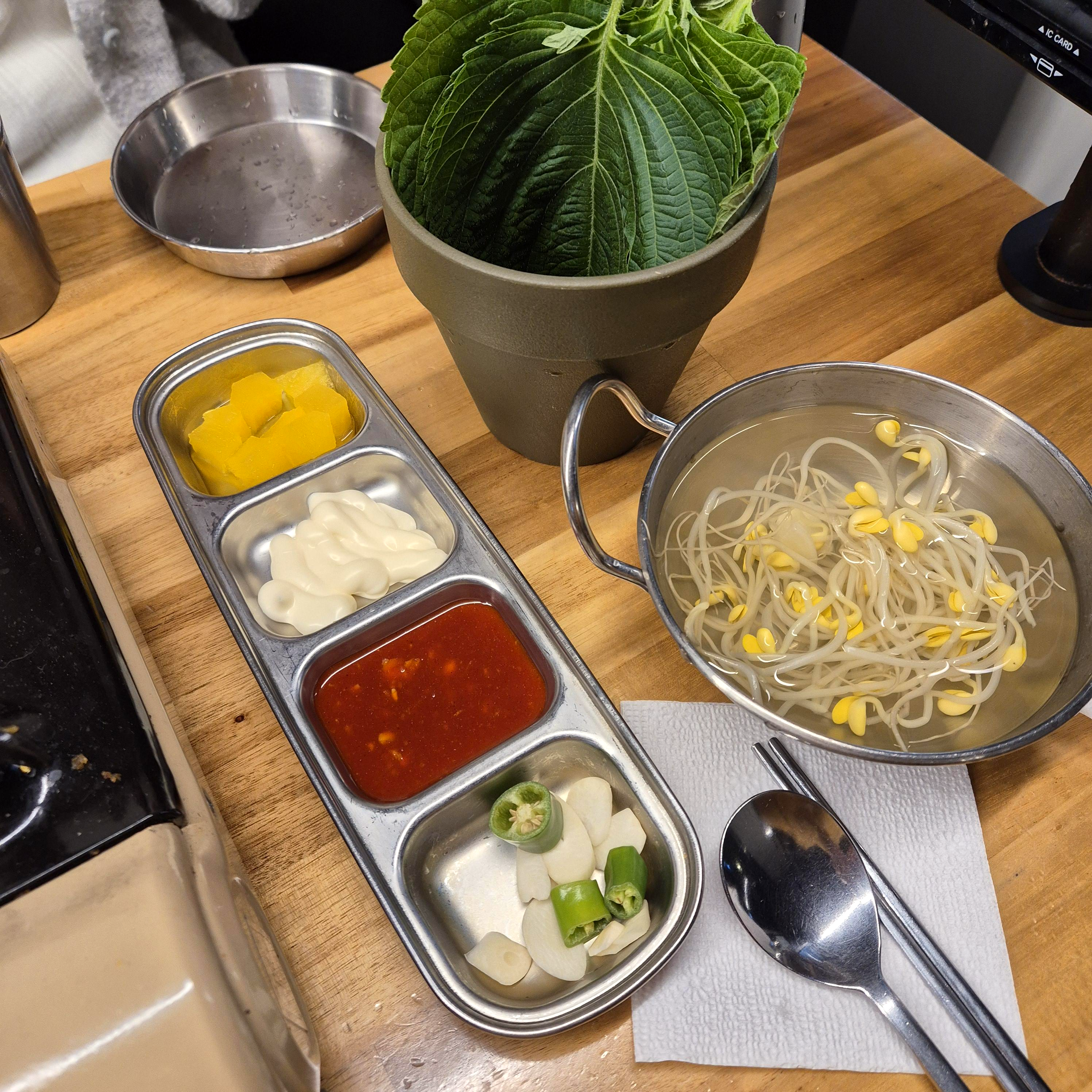 주문을 하자마자 상세팅이 싹싹싹 되었다. 정말 필자가 곱창을 먹을 때 꼭 먹는 2가지 깻잎과 콩나물국이 딱 나오니 일단 아주 만족스러웠다.