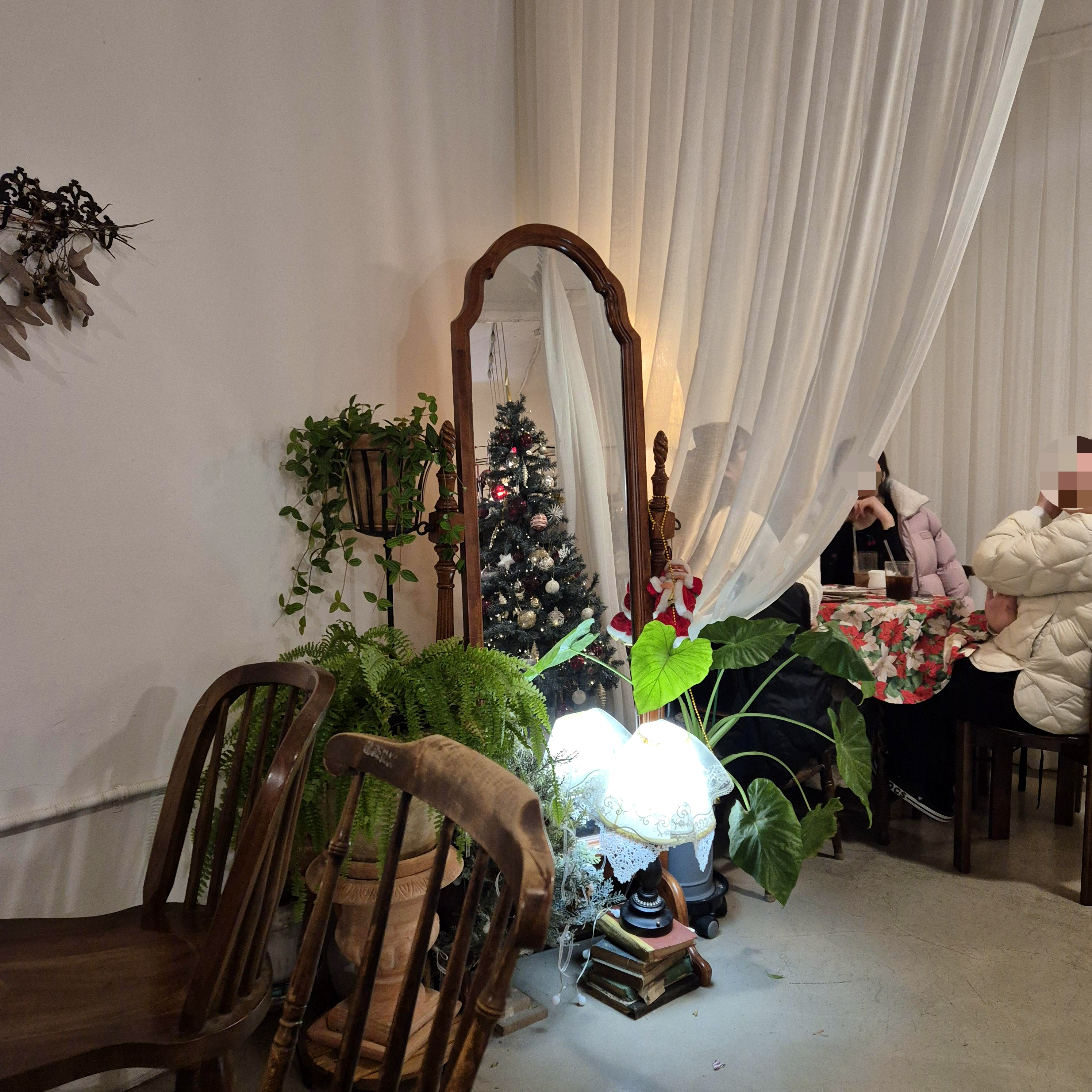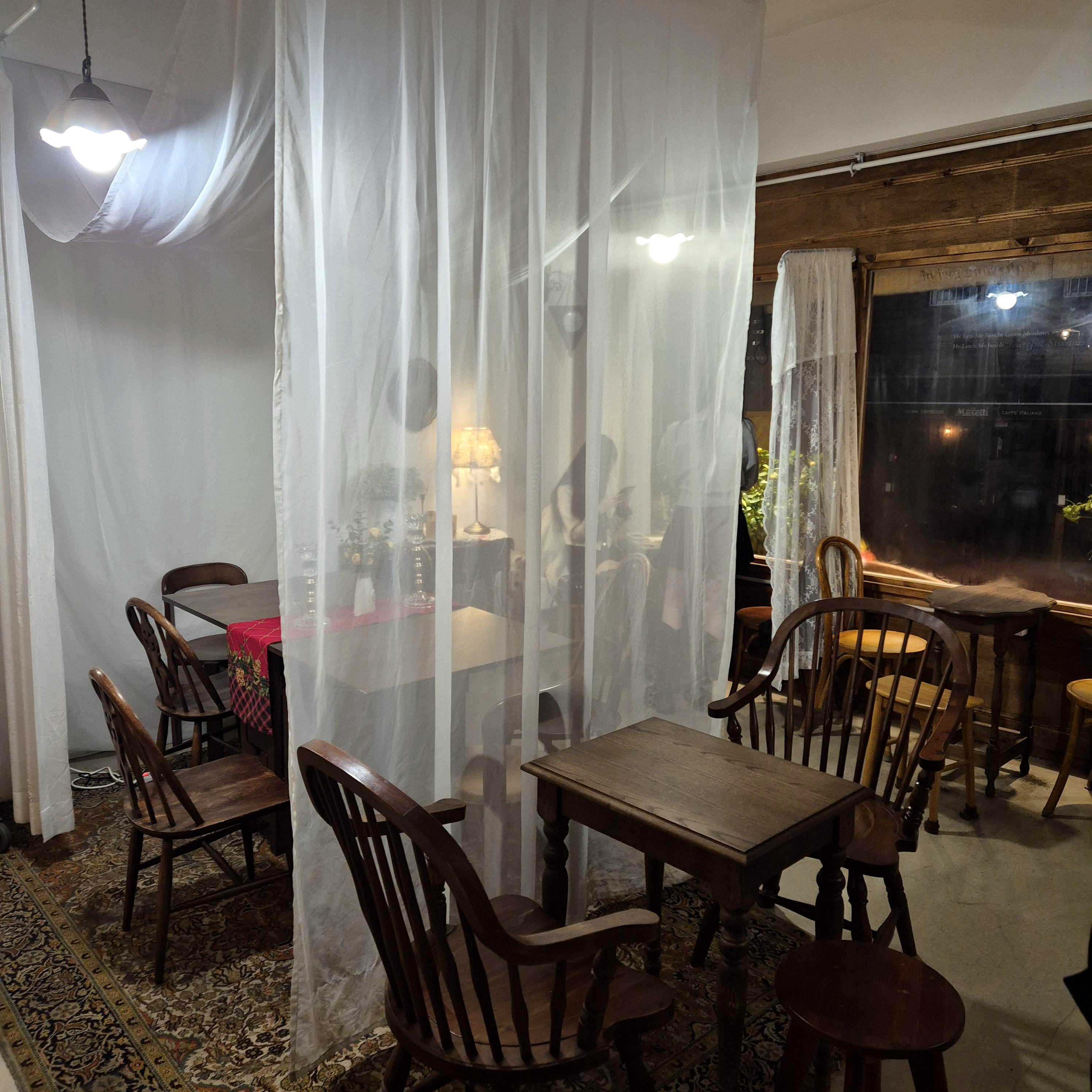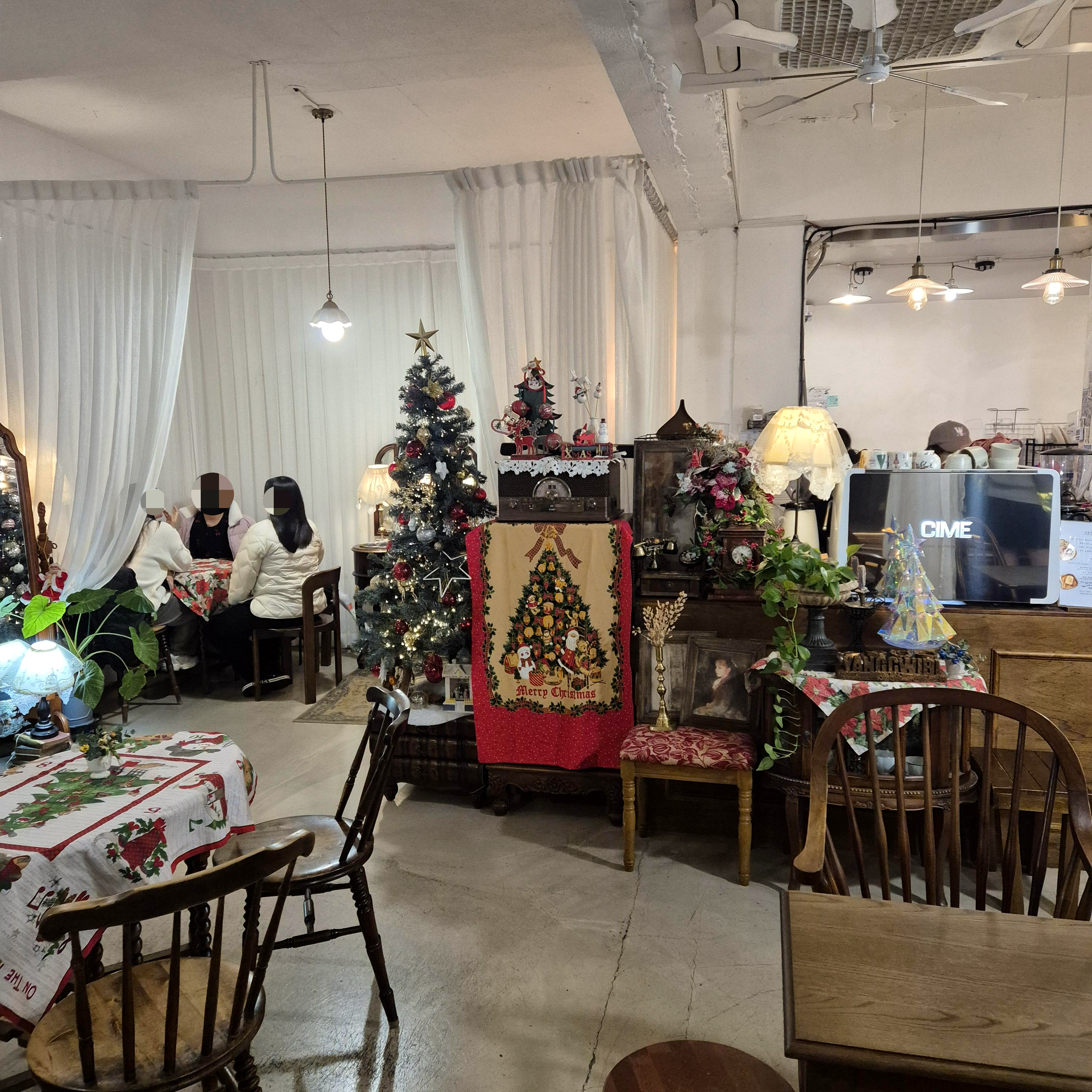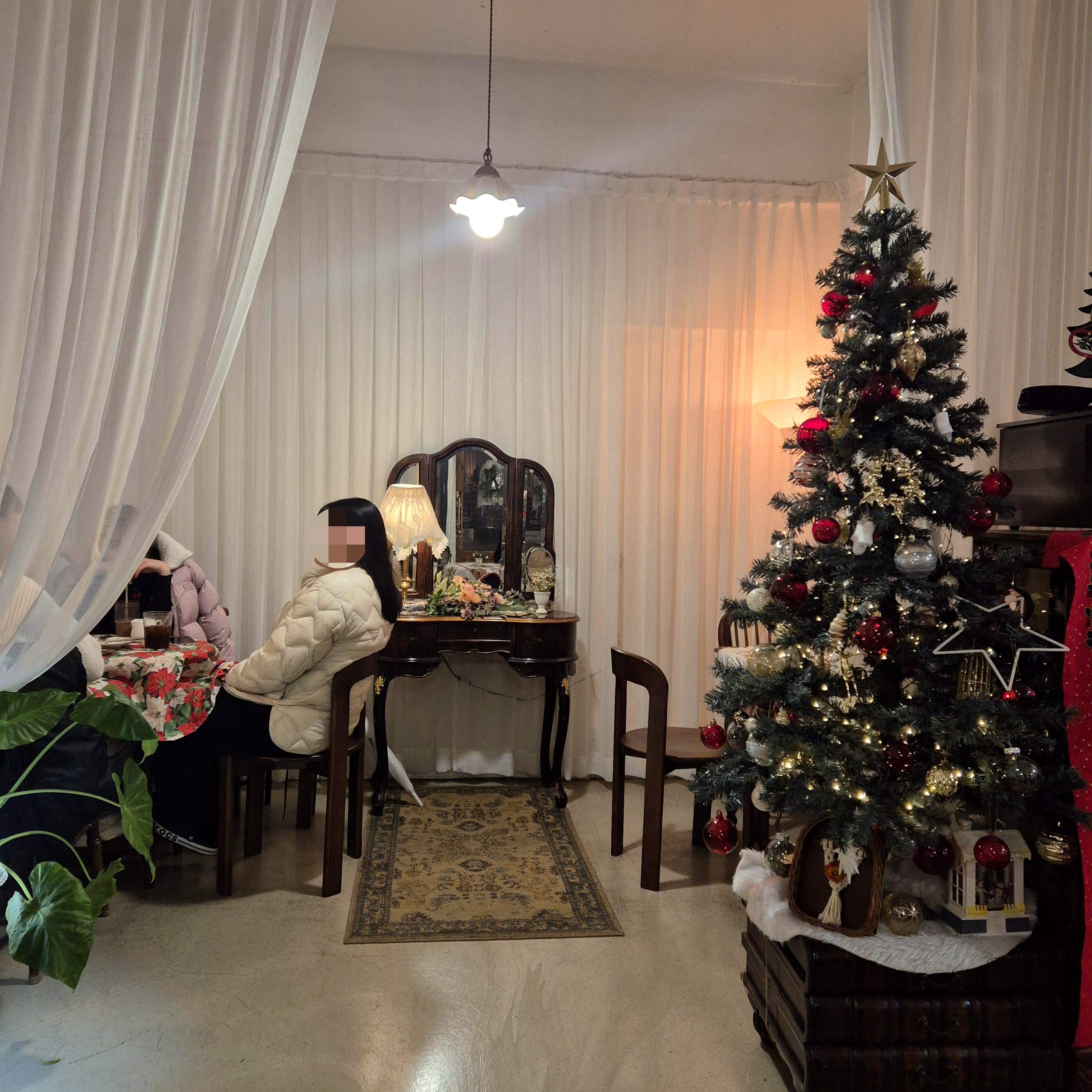 연말이라 곳곳을 이쁘게 꾸며놓은 양귀비카페였고, 하늘하늘한 커튼을 칸막이로 사용한 인테리어가 더욱 인상 깊었던 것 같다.