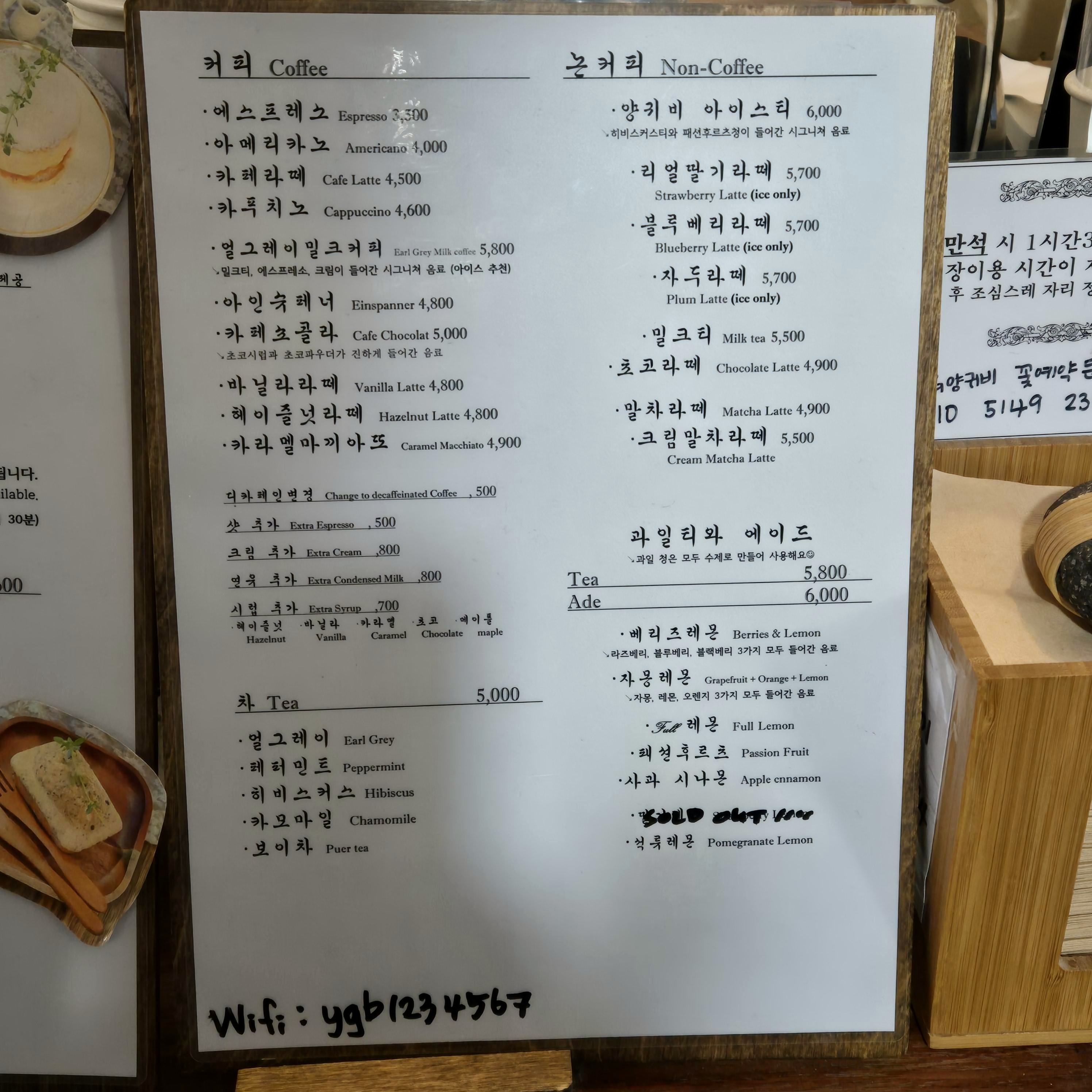 먹음직스러운 디져트도 많았지만, 배가 불렀던 우리는 커피만 주문하였다. 날이 조금 추웠음에도 아아를 포기할 수 없었던 필자였다. 약간 옛 카페인 가베 느낌의 메뉴판이었다.