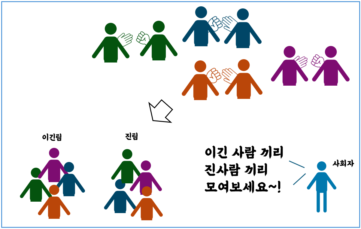 팀나누기 제목이 곧 내용인 유유상종, 비슷한 사람들끼리 모아서 팀을 구성하는 팀정하기 방법이다. "뭐 이런 사람들끼리 뭐였어?"라는 반응이 나올 수 있는 리스크는 있지만, 게임 콘셉트와 맞는다면, 나쁘지 않은 팀정하기 방식이다.