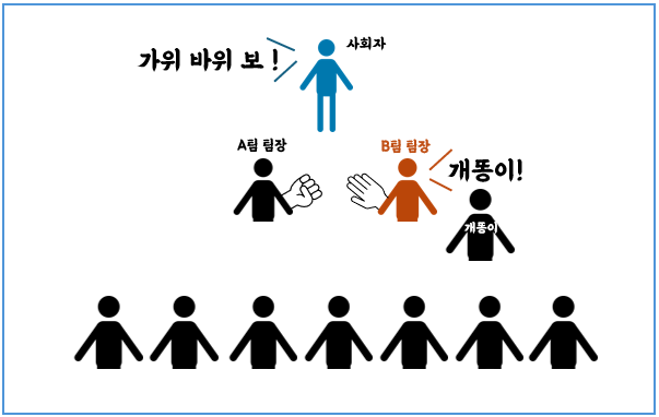 - 그 둘씩 가위바위보를 하여 이긴 사람과 진사람을 구분한다.