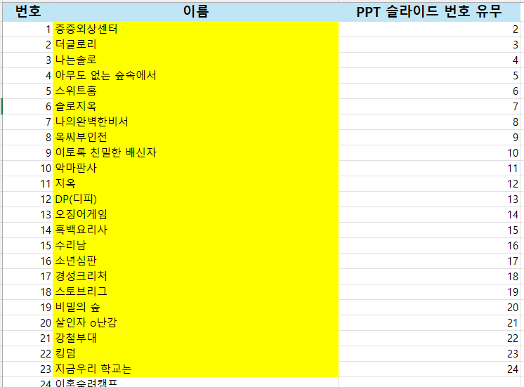 자료에 넷플릭스에서 방영한 제목 50개 정도를 넣었는데, 생각보다 범위가 광범위한 대신, 알법한 것들을 꼬집어 내기가 힘들었다. 되도록 최신작 위주로 하였고, 현재 (2025년 1월) 방영 중인 기준으로 주로 하였다.
