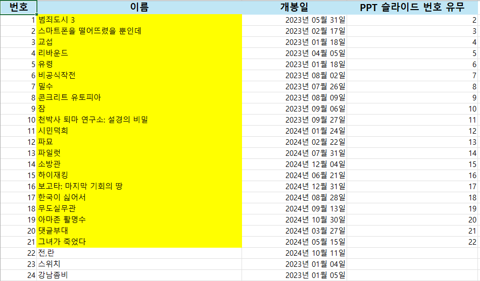 자료에 영화 제목 총 90개 정도를 넣어놨으니, 참고하셔서 진행하시면 되겠다. 2023년 이후에 제작된 영화만 선별해 보았다.