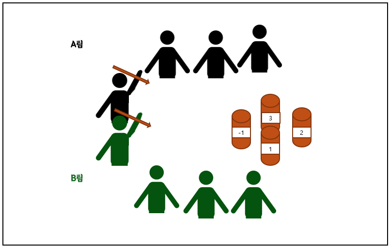 - 순서를 정하고, 각 팀별로 릴레이 형식으로 비석을 쓰러뜨리면 된다.