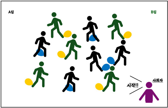 이 게임도 제목에서 알 수 있듯이 말 그대로 우리 팀의 풍선을 상대팀에게 넘기는 게임이다. 쉬운 게임이지만 체력소모가 은근히 있는 게임이며, 몸을 부딪히는 일은 없기 때문에, 그래도 안전한 게임이라고 볼 수 있다. 이해를 돕기 위해 이미지를 그려보았다.