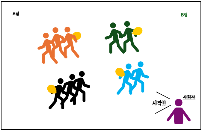 - 인원수에 맞추어 시작 팀을 정한다. 개인전도 가능하나 이왕이면 팀전이 좋겠다.