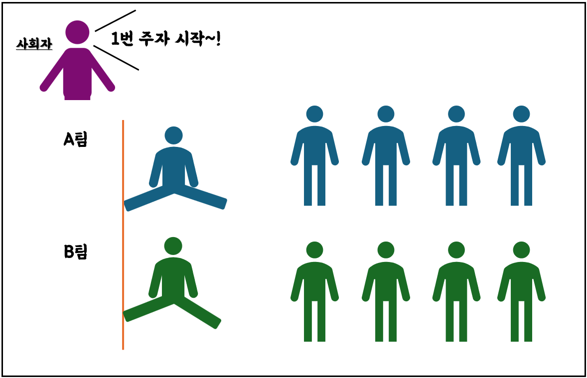 팀전일 때 가끔 했던 다리를 이어 찢어 더 길게 찢은 팀이 승리하는 쉬운 게임이다. 아이스브레이킹 및 스트레칭 용으로도 좋은 게임이라고 할 수 있겠다. 하기 전에는 싫어해도 막상 시작하면, 몰입도가 좋은 게임이다. 이해를 돕기 위해 이미지를 그려보았다.