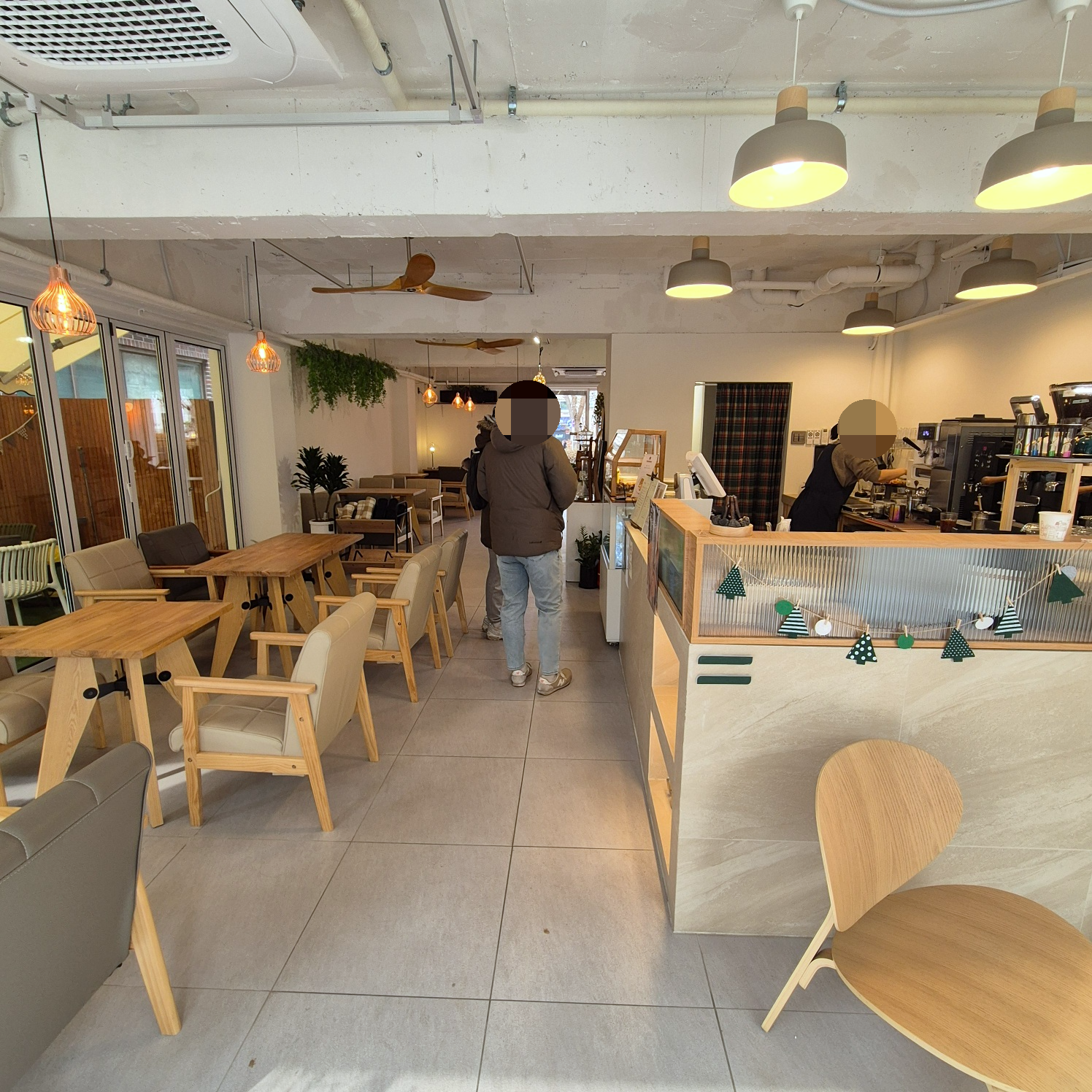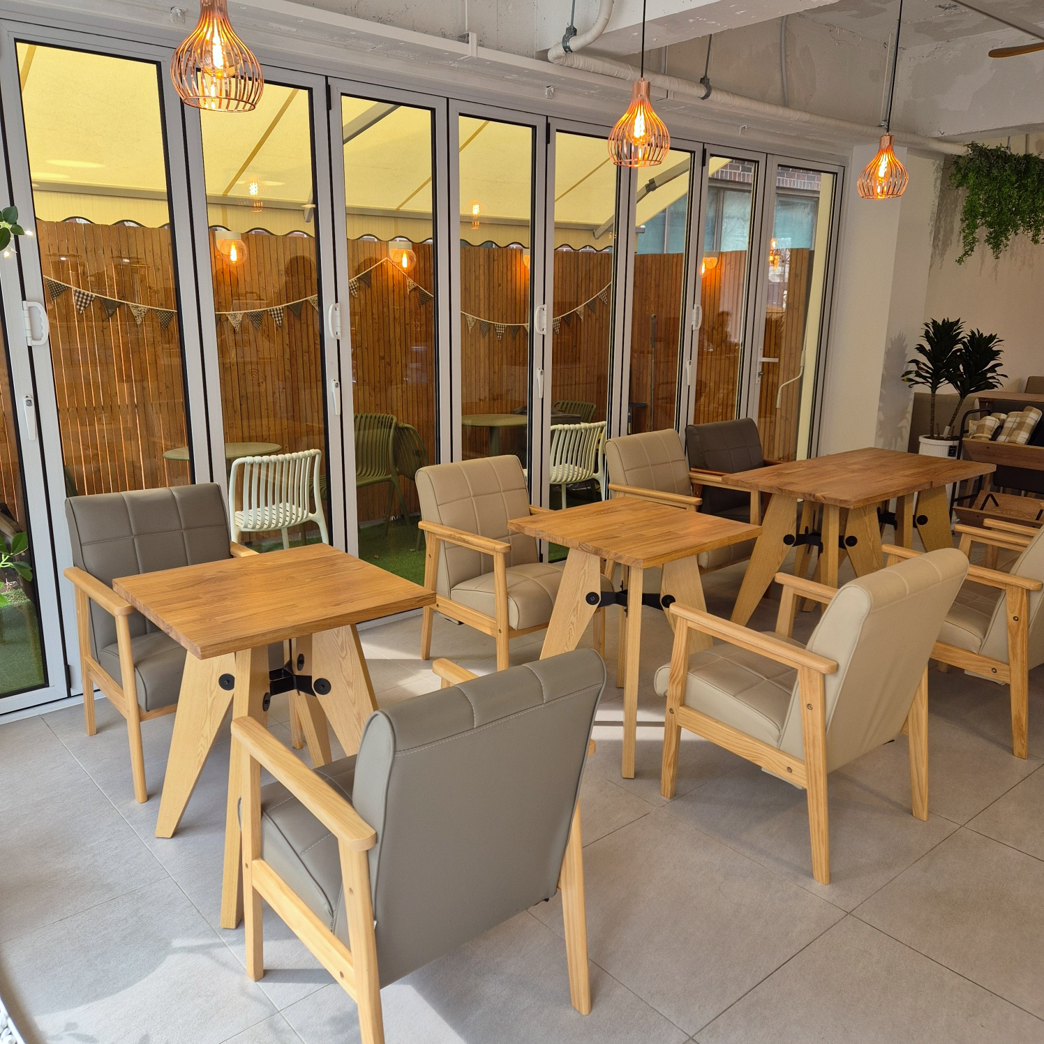 나무 책상과 의자에서도 온기가 느껴지는 카페