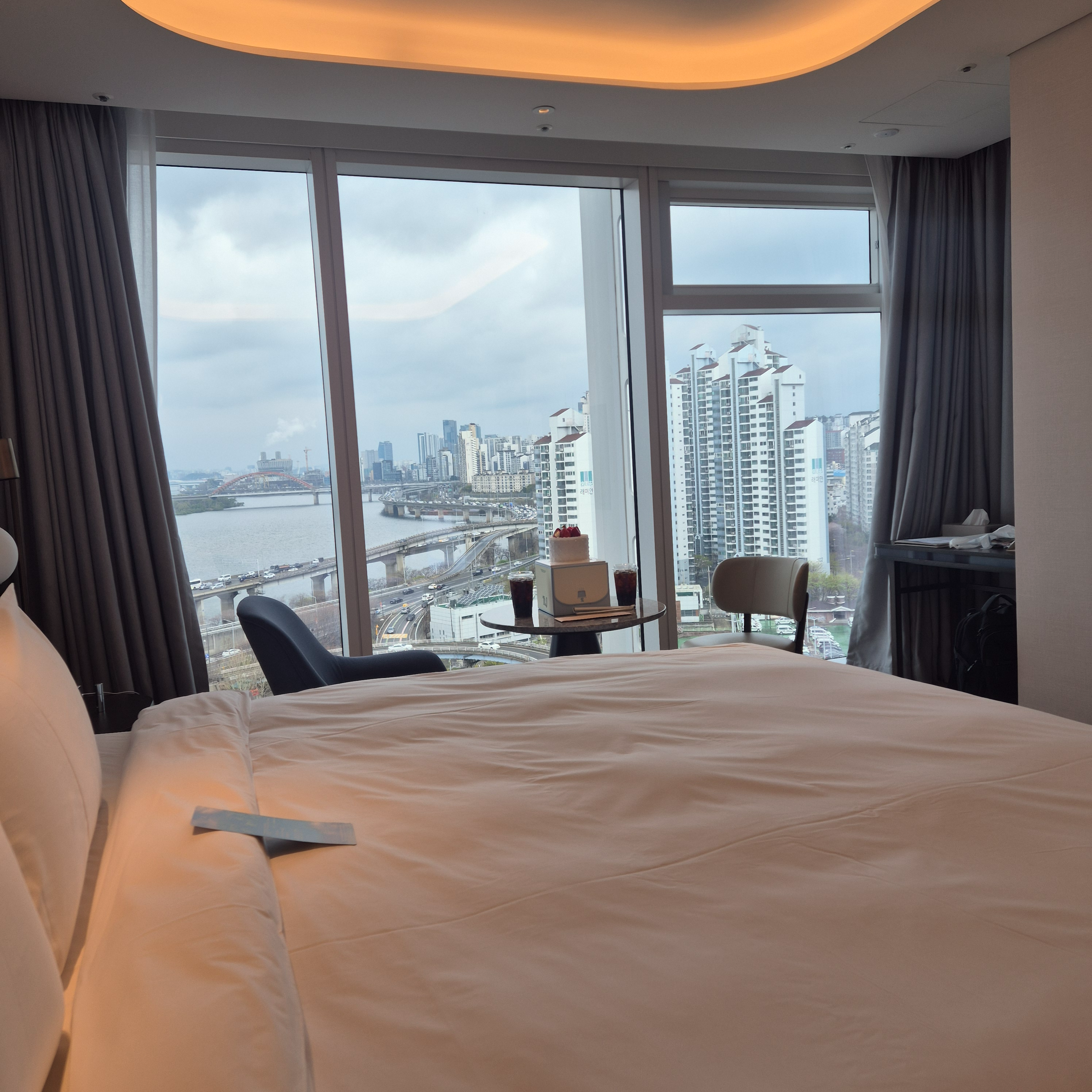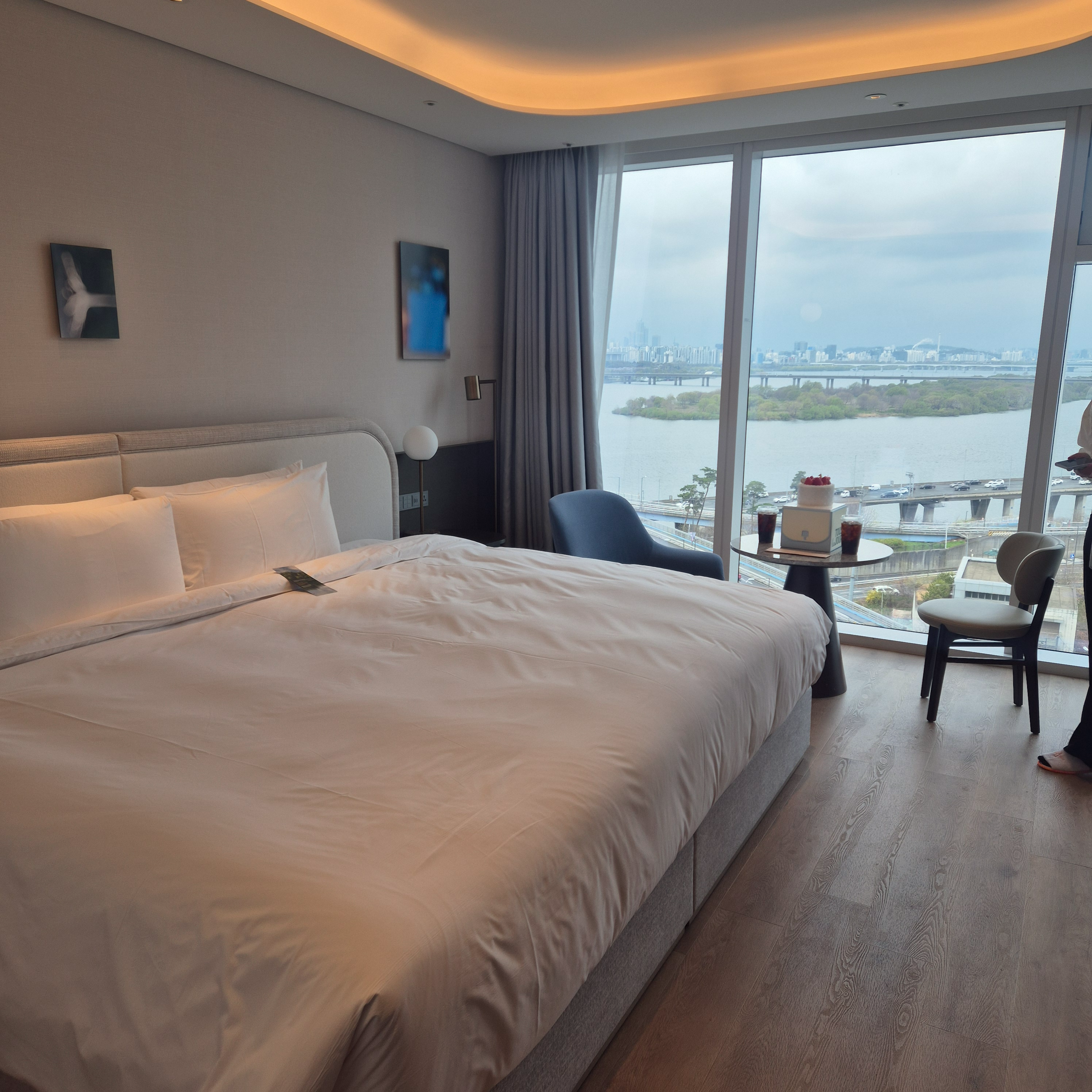 일단 방문에 카드키를 꽂으면, 커튼이 자동으로 스르르륵 쳐지면서 환영이라도 하는 듯 탁 트인 한강뷰가 보여요. 진짜 "와... 사람들이 이래서 높은 곳에 살고 싶어 하는구나" 하면서 뷰에 1차 감탄했고, 침대가 너무 커서 2차 감탄했어요.