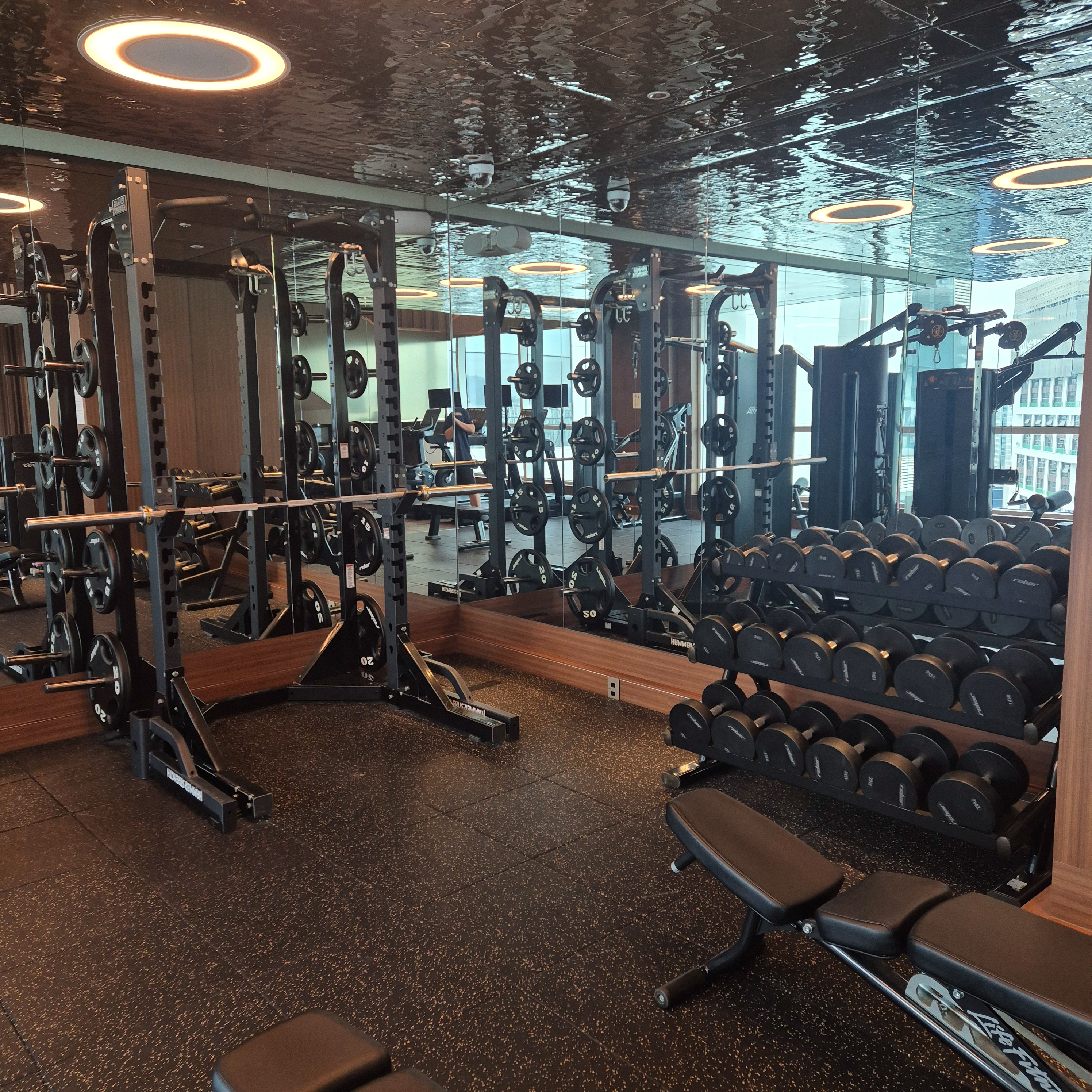 계단으로 내려가면 아담한 사이즈의 피트니스가 있는데요. 당연히 깨끗하고 쾌적한 분위기 장착되어 있고, 기구가 아주 많지는 않지만 기본적인 것들은 있더라고요.