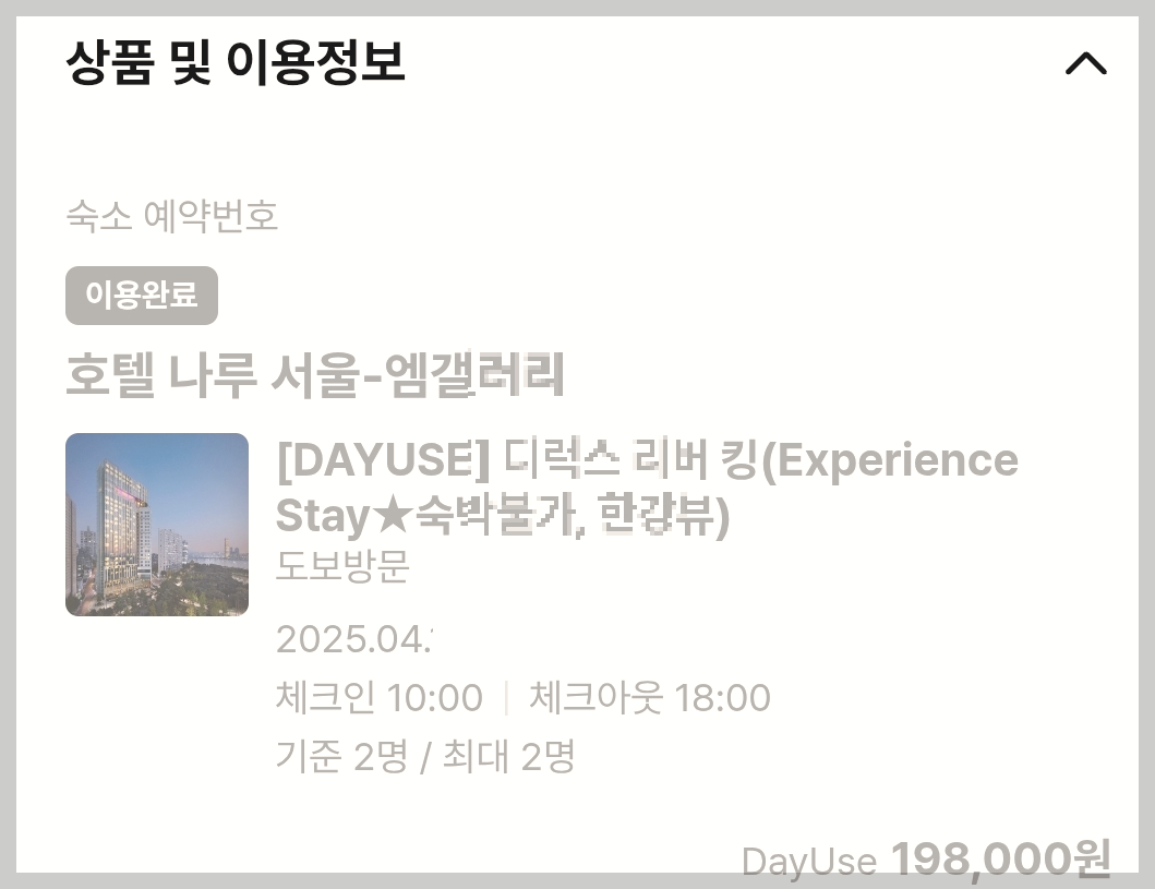 저희는 1박이 어려운 상황이었어서, 다른 방법이 뭐가 있나 알아보다가 DAYUSE(데이유즈: 일정시간 이용하는 것)로 예약했어요.