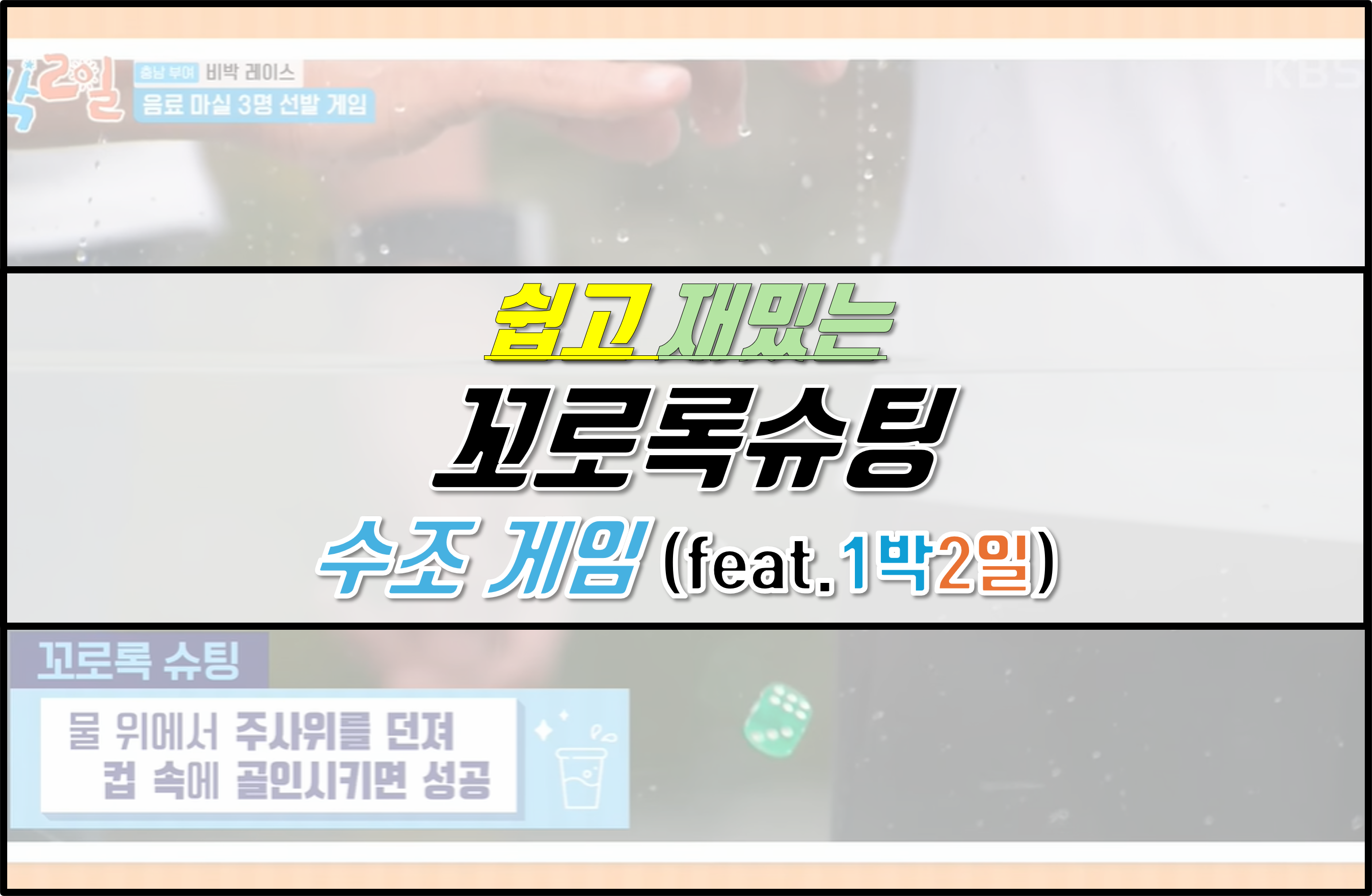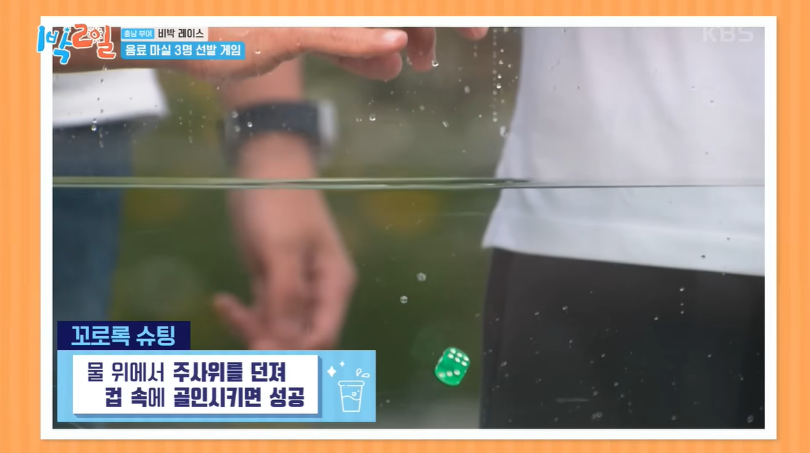 제목에서 유추할 수 있듯이 수조에 주사위 등 물건을 떨어뜨려 원하는 목표 안에 넣는 게임이다. 아주 간단하고 쉬운 듯 하지만, 생각보다 상당한 정확도가 필요하며, 개인전, 단체전도 가능하다. 예측할 수 없는 맛이 묘미인 재밌는 게임이다. 1박2일에서 진행되었던 게임이고, 그만큼 어느 정도의 재미가 보장되어 있다고 할 수 있겠다.