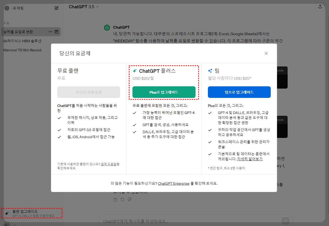 하기의 사진에서 좌측 하단의 '플랜업그레이드'를 누르면,