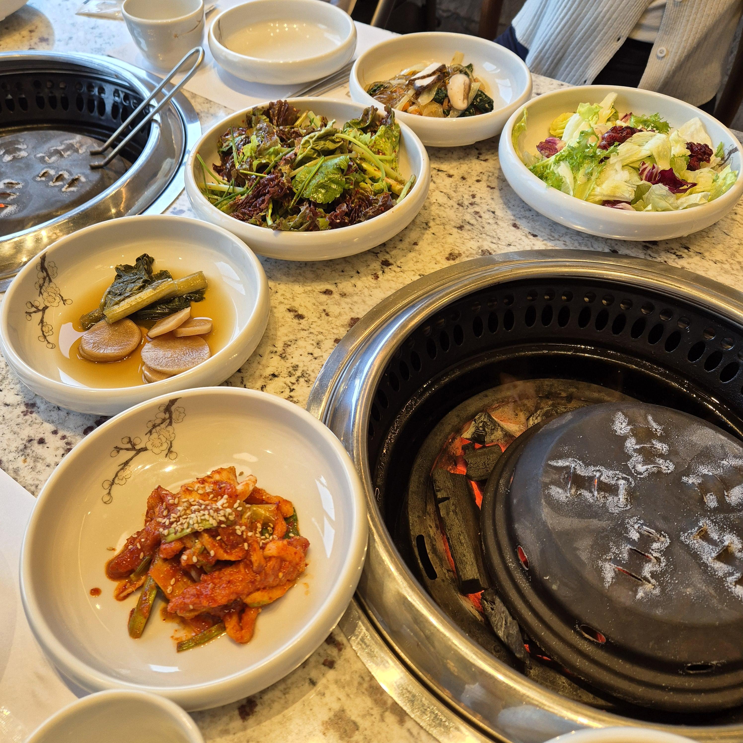 5명이라서 두 군데에 불을 놓아주셨다. 그리고, 후기를 보다 보니 강강술래의 잡채가 그렇게 맛있다고 소문이 났던데, 정말 맛있었다. 가자미 무침(?) 도 달콤 새콤하니 맛있었다.