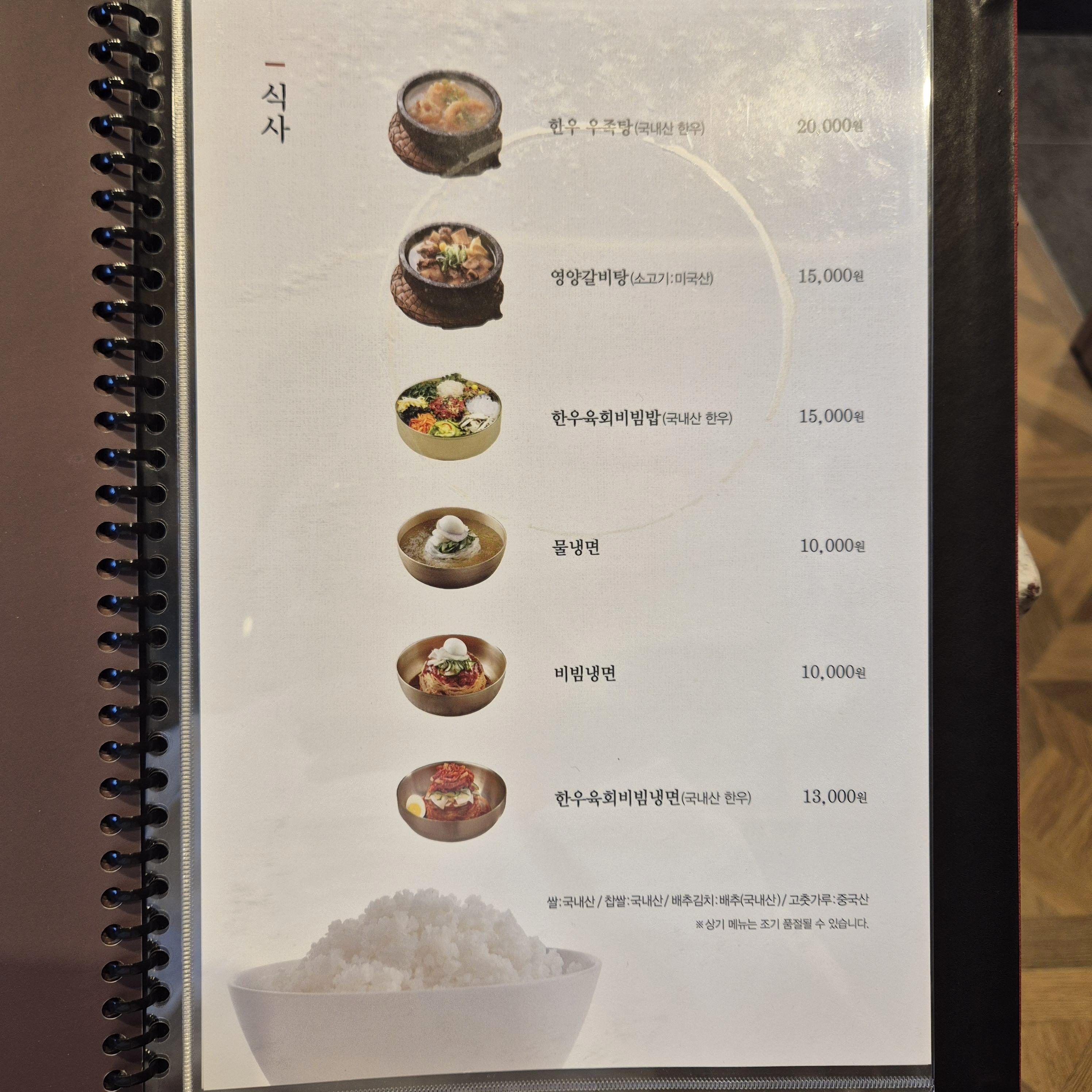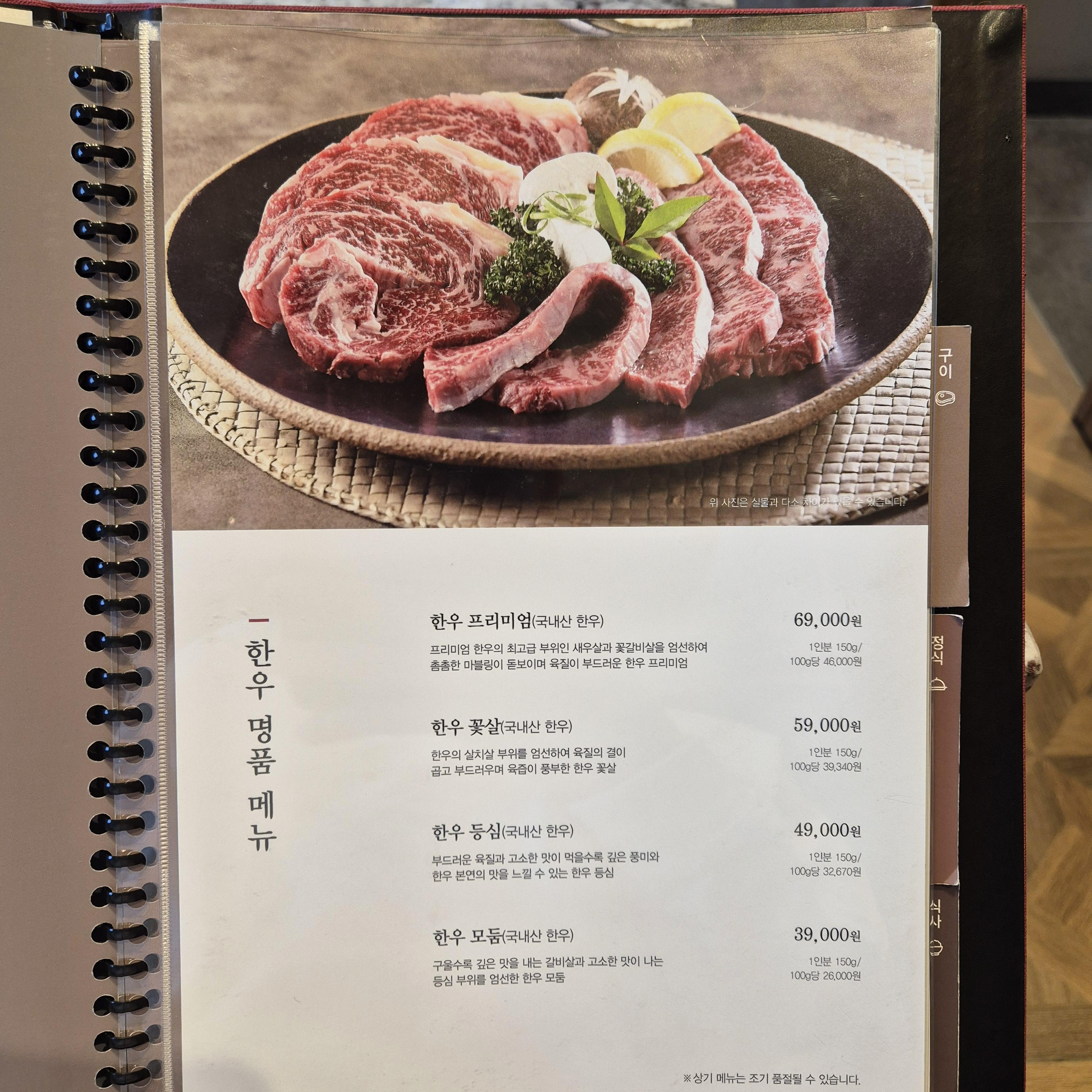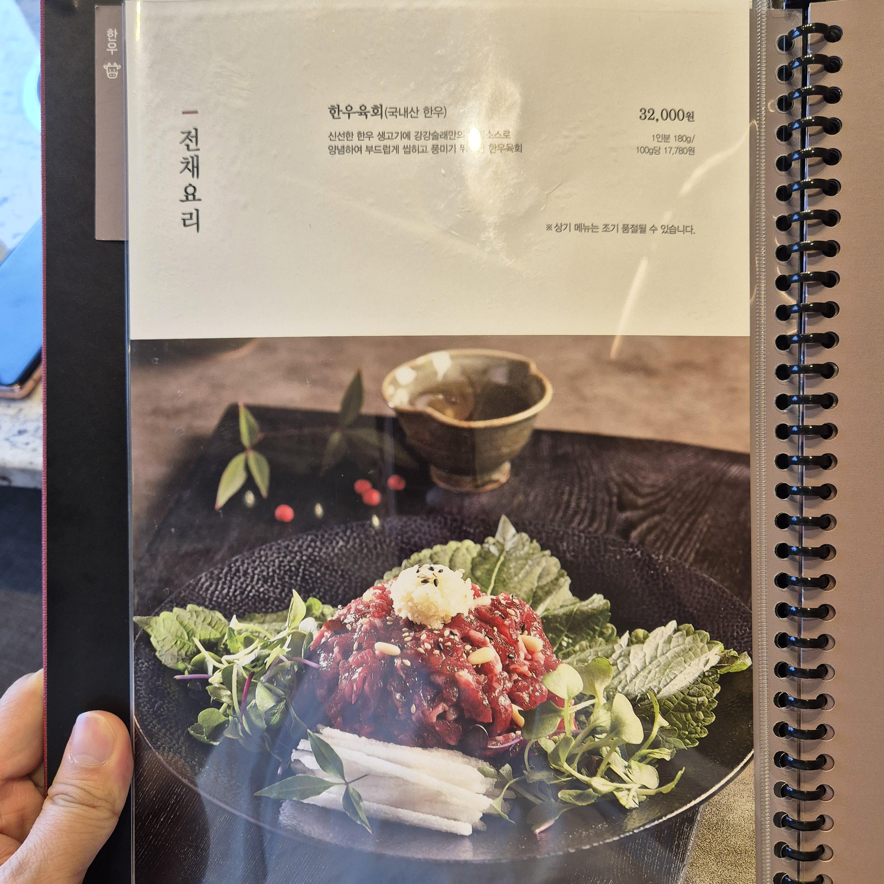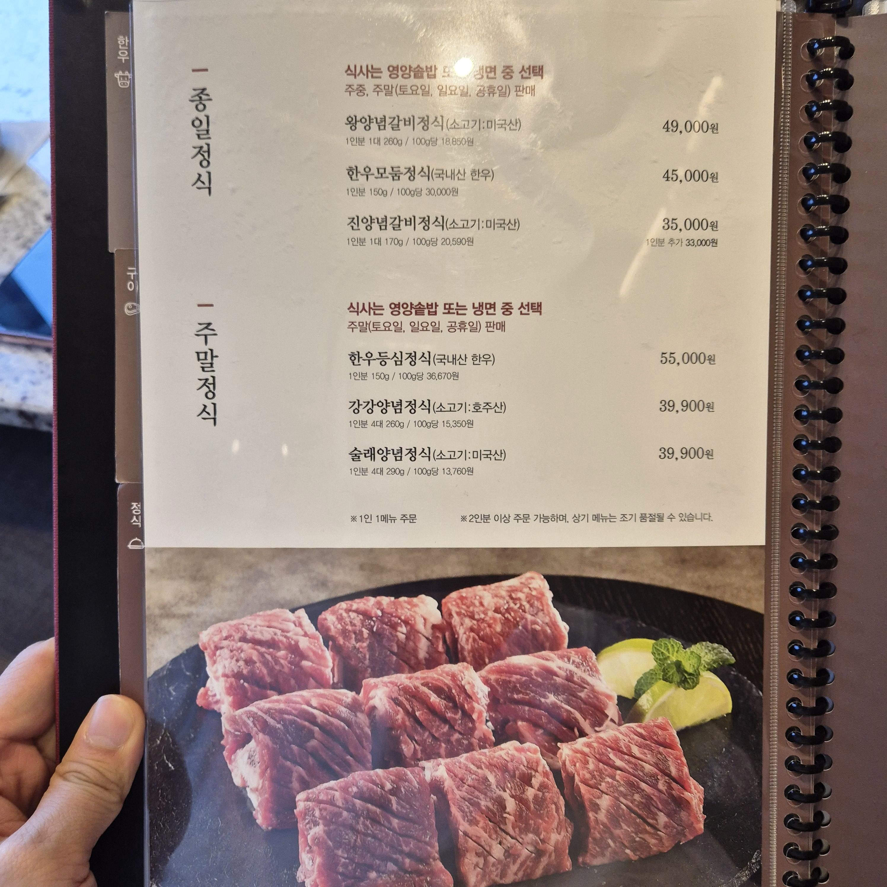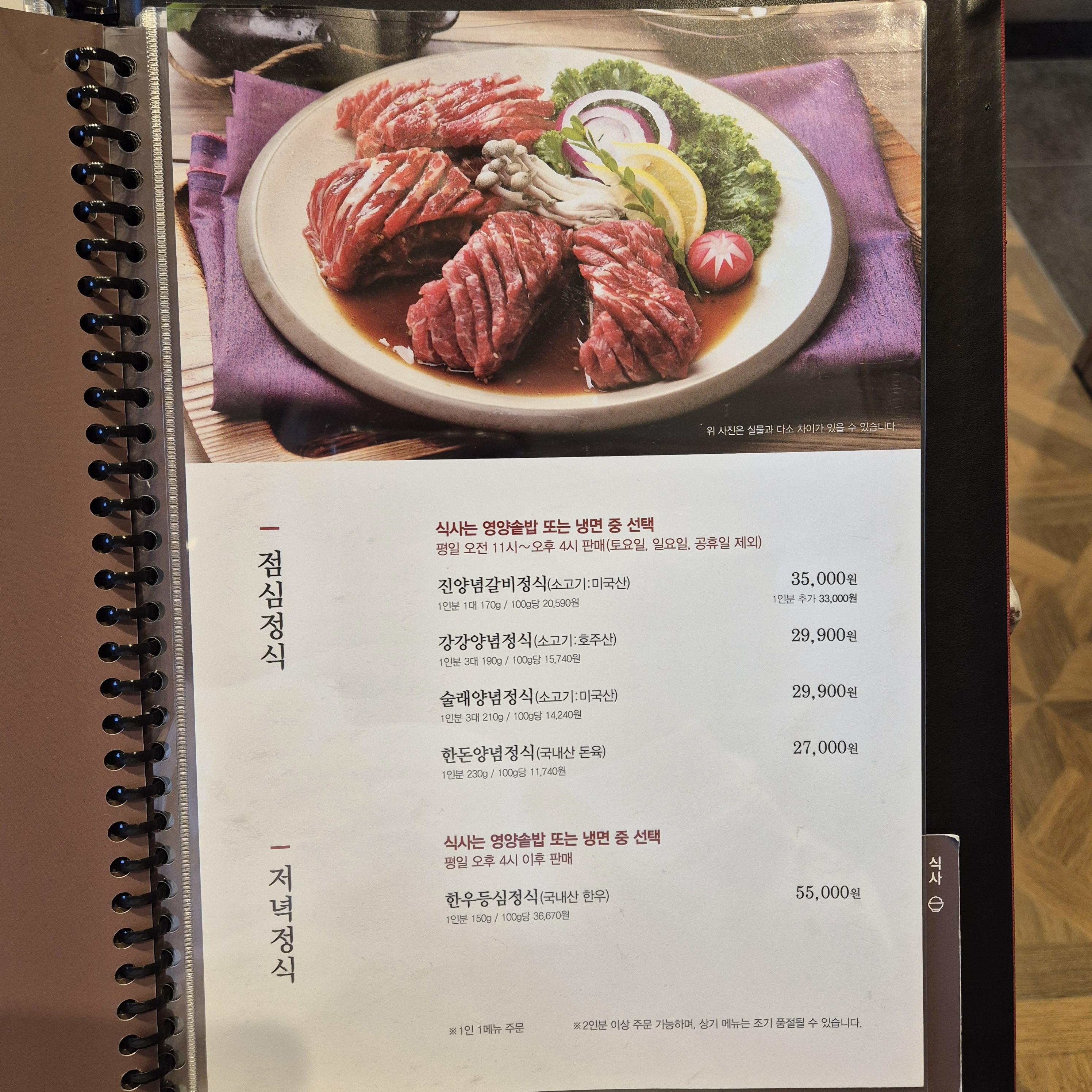 한우, 돼지고기는 물론이고 전채요리인 육회까지 있으며, 종일 정식과 주말 정식도 구분되어 있다.