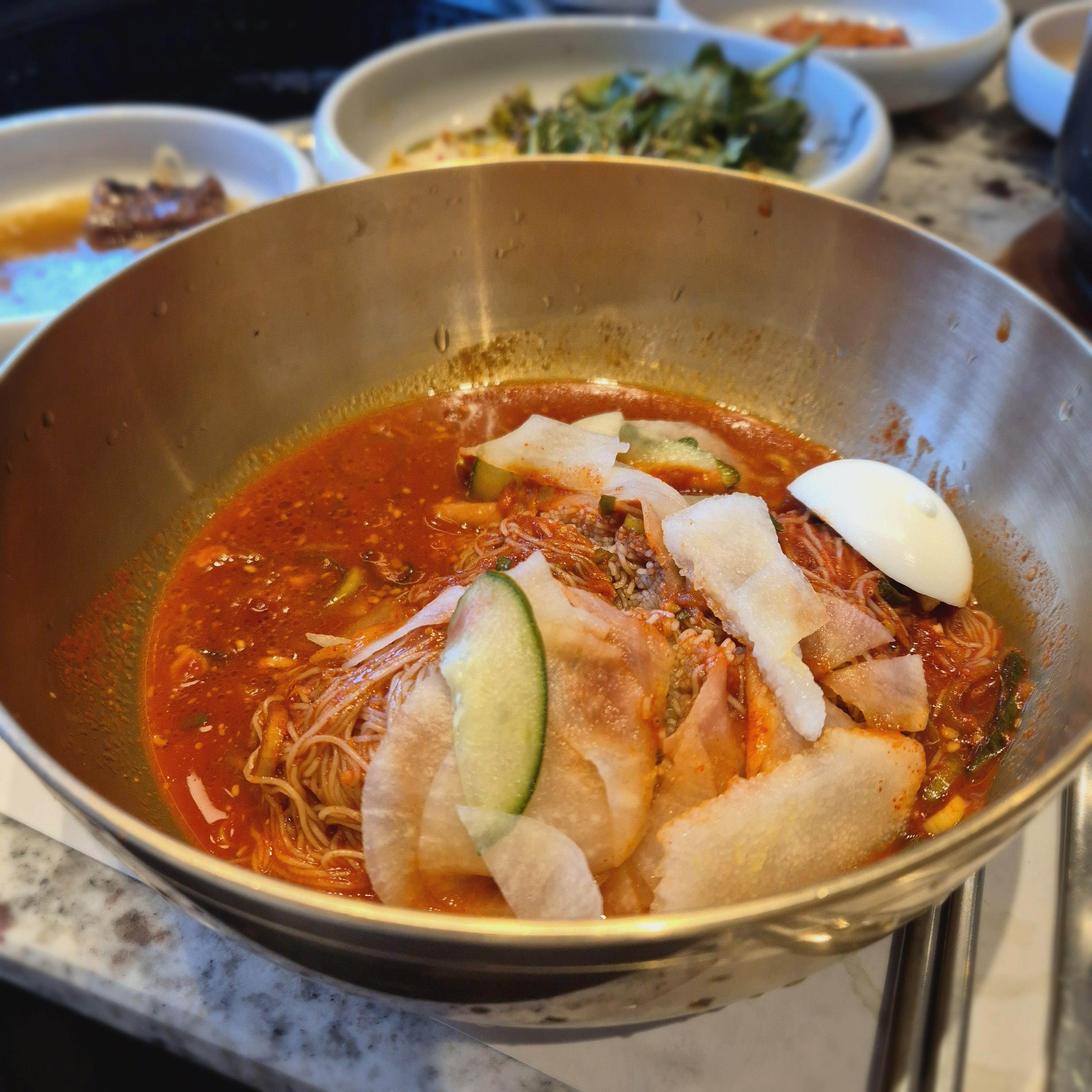 양은 그다지 많지는 않았으나 적당히 매콤 달달하니 좋았고, 냉육수를 추가로 요청드려서 주셨는데, 받은 냉육수를 넣어먹으니 깔끔하게 마무리를 한 기분이었다. 면이 질기거나 간이 불편하게 강하거나 하지 않은 고깃집의 정석 같은 냉면이었다.
