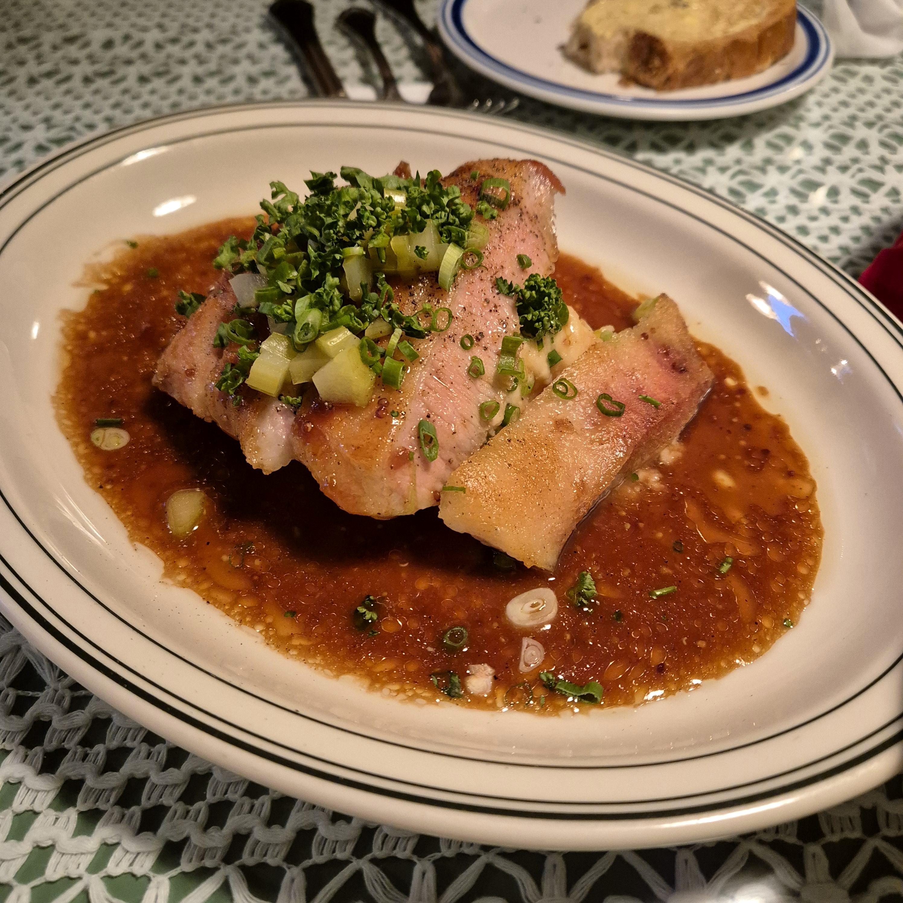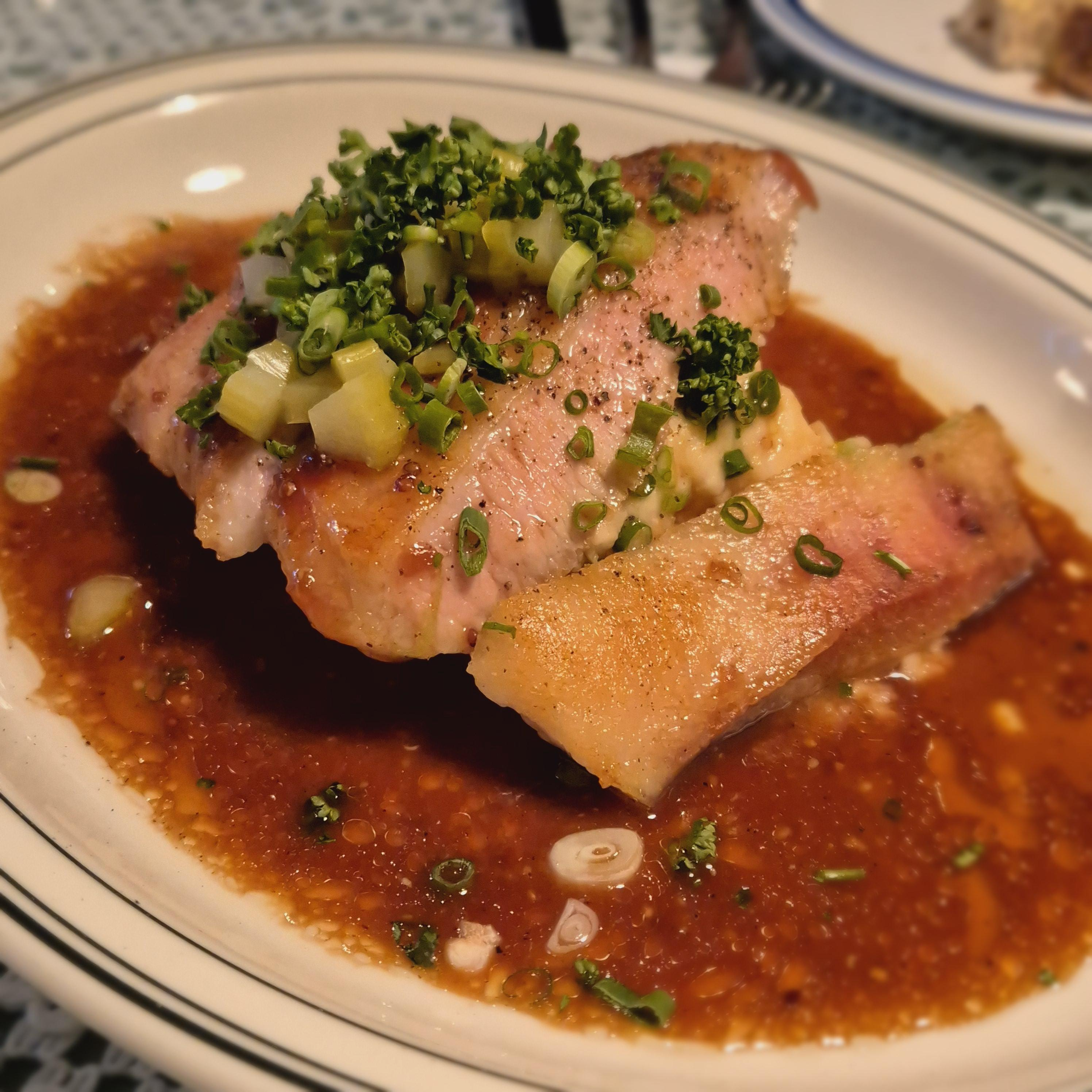 도톰한 항정살과 사진에는 보이지 않지만, 부드러운 감자, 그리고 소스까지 딱 조합해서 먹으면 입에서 녹으면서 탱글한 고기의 맛과 소스의 풍미가 전해진다. 양은 적지만 강한 인상을 주었다. 가장 먼저 동난 음식이다.