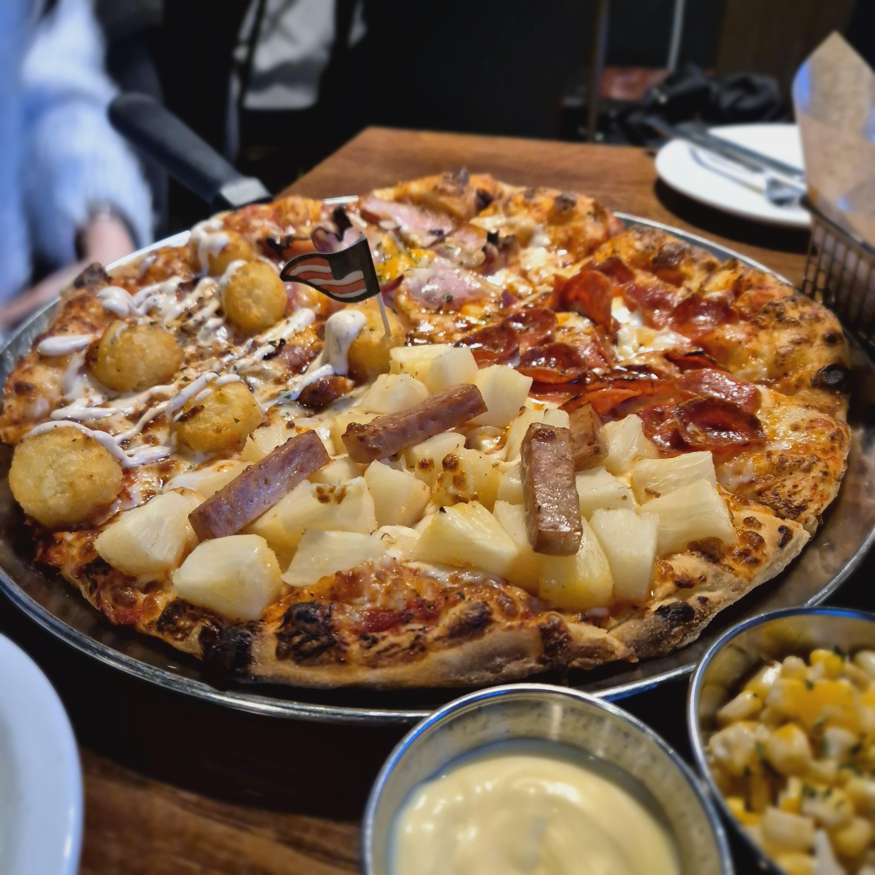 드디어 엄청 기다린 쿼터가 나왔다. 솔직히 비주얼은 끝장이었다. 최근 이런저런 피자를 가끔 먹어봤는데, 정말 토핑이 차원이 달랐달까. 필자의 일행은 4가지 맛으로 하와이안, 페퍼로니, 포테이토, 베이컨치즈 이렇게 시켰다.