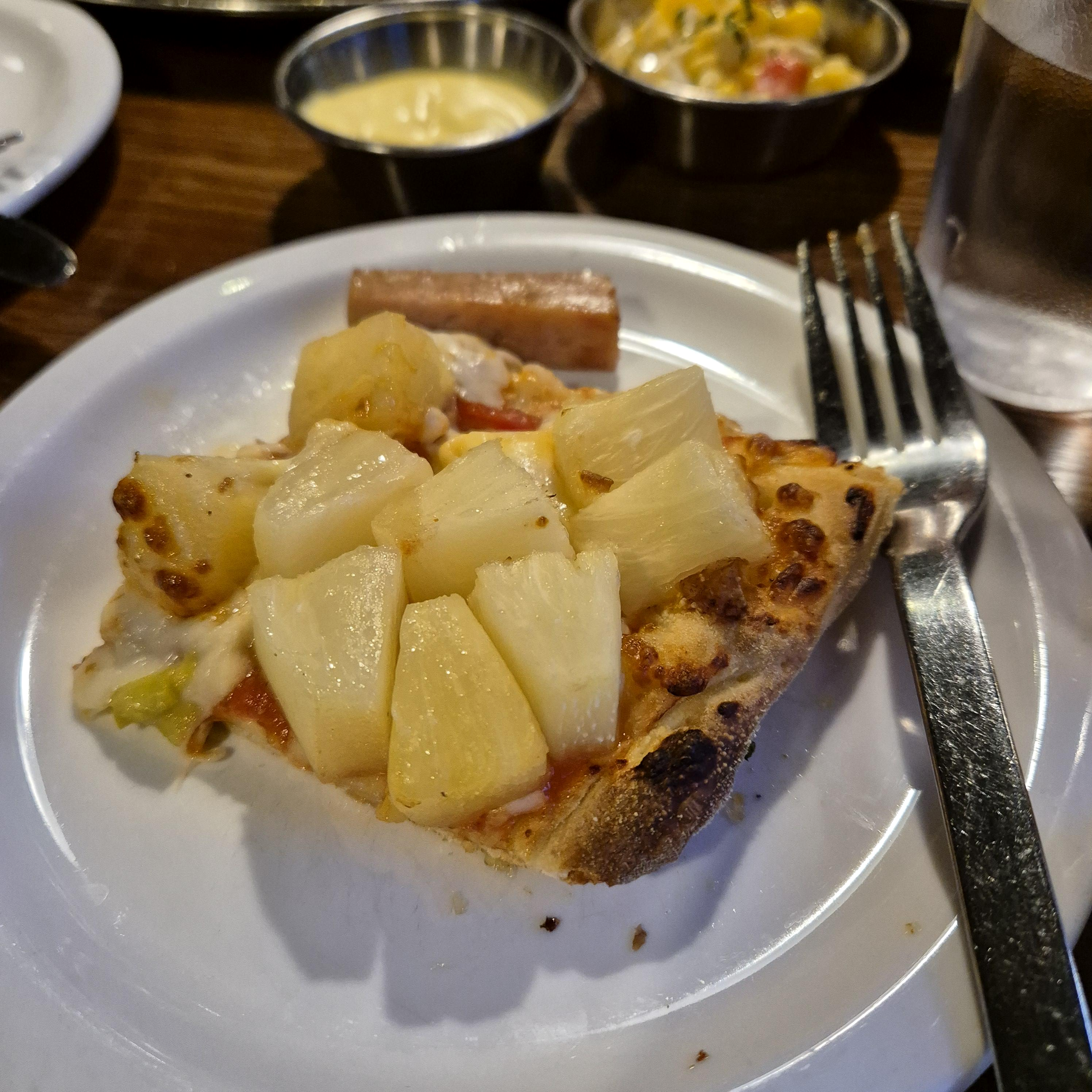 하와이안에 들어있는 파인애플의 개수에서 일단 압도한다. 이렇게 파인애플 많이 주는 피자집이 또 있을까. 피자를 한입 먹을 때마다 파인애플이 2~3개씩 들어와서 같이 씹히는데, 식감도 좋고, 달달하면서도 신맛이 입맛을 돋웠다. 거기에 남녀노소 좋아할 햄까지 완전 따봉이었다.