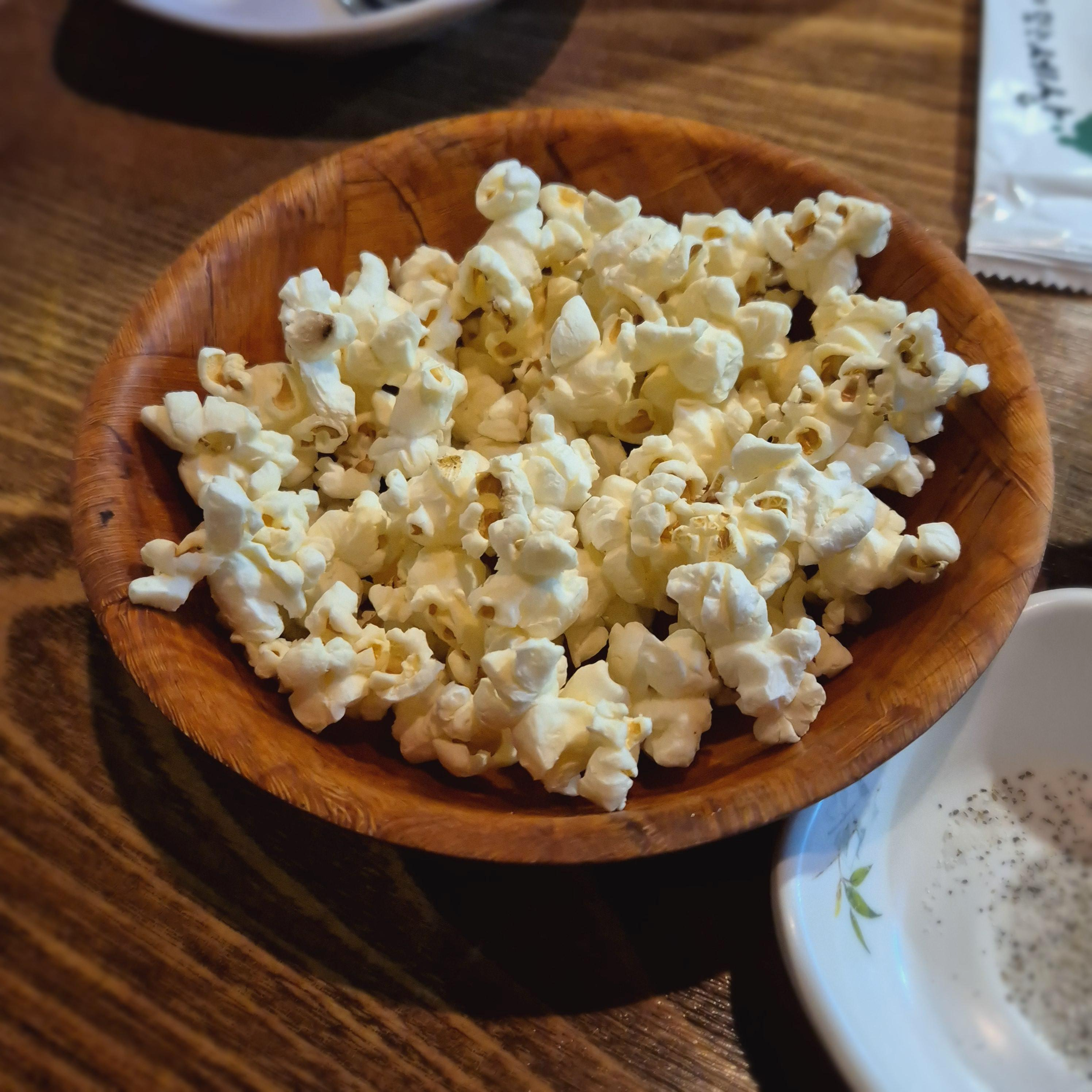 딱 치킨집 기본 상차림이었다. 양배추, 치킨무, 소스, 간장까지 더할 나위가 없었다. 가끔 양배추에서 씁쓸한 맛이 나는 치킨집, 돈가스집들이 있는데, 미락치킨은 그렇지 않고 나름 신선해서 합격이었다. 그리고 우리가 너무 많이 리필한 친구가 있었는데, 바로 팝콘이었다.