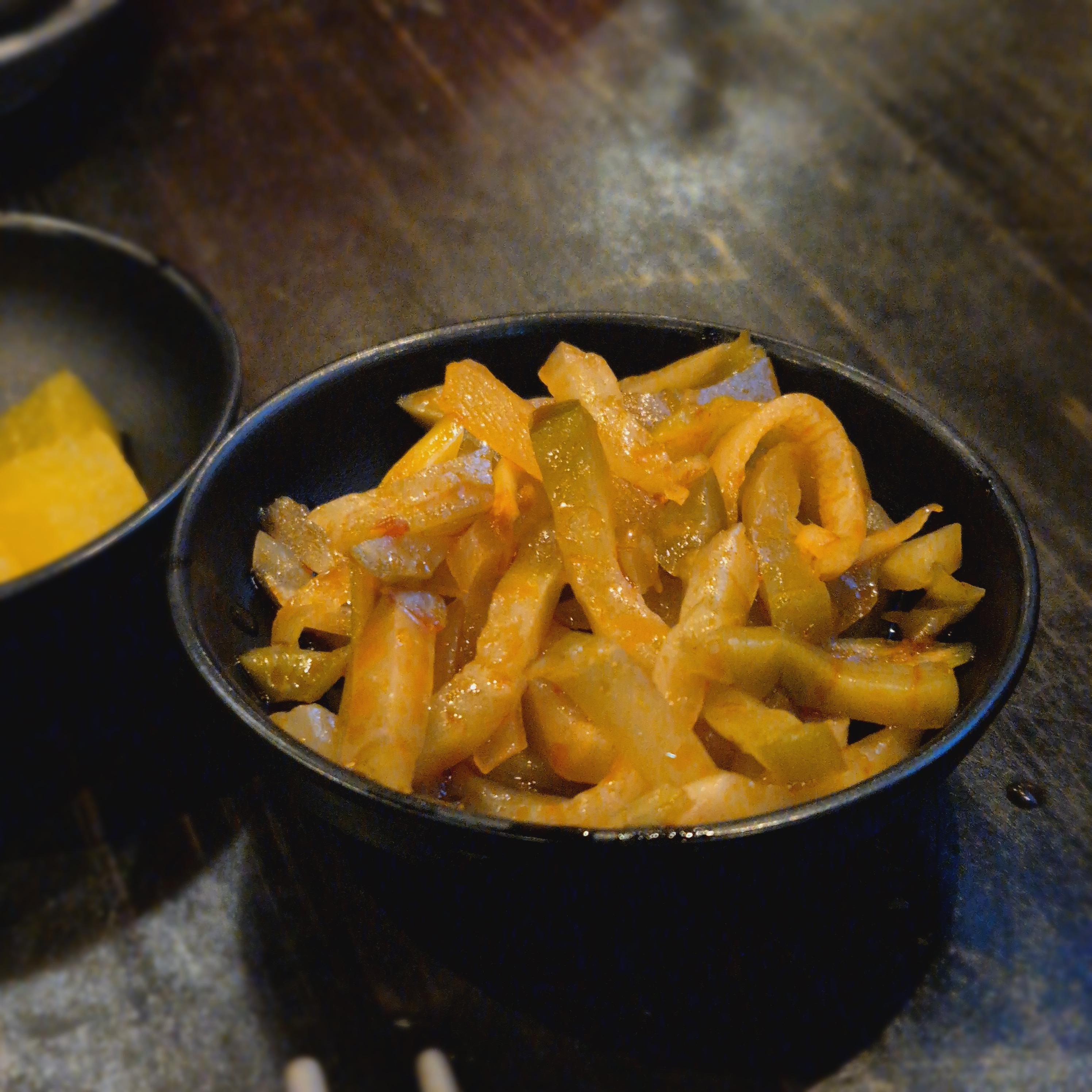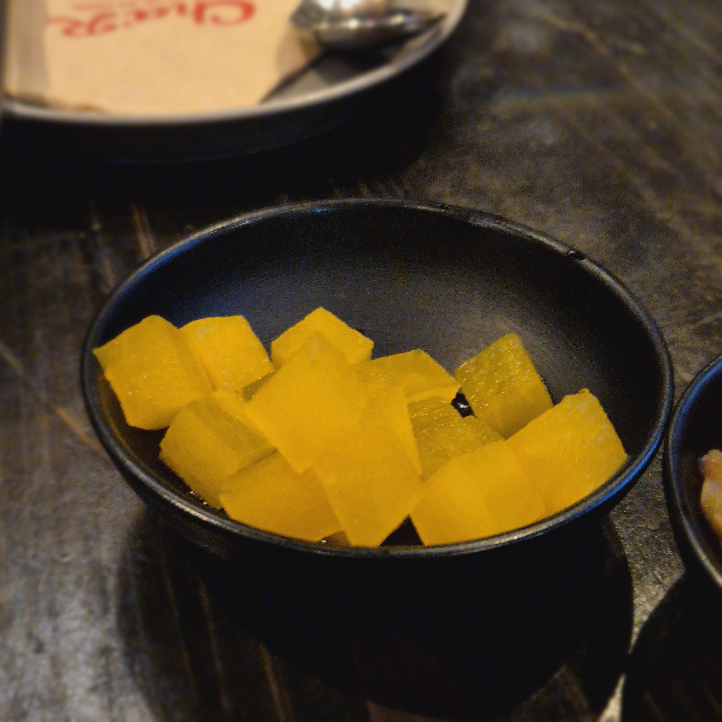 수저를 세팅하고 물 한잔 마시며 기다리고 있었는데, 짜사이와 단무지가 나왔다. 개인적으로 짜사이를 참 좋아하는데, 차알의 짜사이는 생각보다 짜지 않아서 더 좋았다. 단무지는 우리가 아는 맛이니 생략한다.
